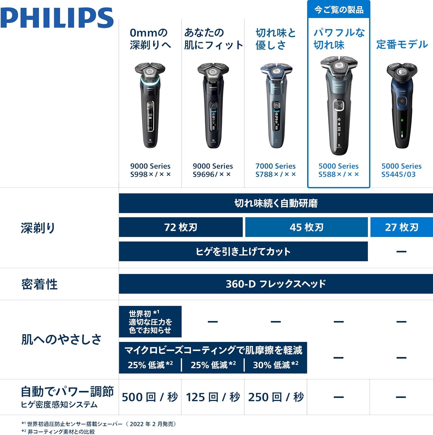 SkinIQテクノロジー搭載。ヒゲの濃さや顔の輪郭を感知し、一人ひとりの個性に合った最適なシェービングへ。毎分90,000回カットする45枚刃で色々な方向に生えているヒゲを効率的に取り込み、しっかり深剃り。コードレス洗浄システム付き。